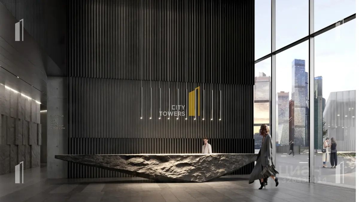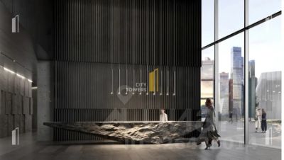 Минималистично оформленное двусветное лобби с 7-метровыми потолками выполнено из гранита, с отделкой архитектурным бетоном и панелями из нержавеющей стали. Такая комбинация материалов и фактур позволила сформировать строгое и лаконичное пространство, настраивающее на рабочий лад.