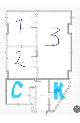 + ДBА кабинета (на плане 1 и 2) по 14 м2, подсобное помещение или миникухня ( на плане К) и санузел с душевой ( на плане С)
