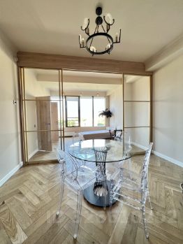 На полу массив ДУБовой доски в модной раскладке ёлочка, но в настоящий момент КОВРОЛИН ( для сохранения на время аренды);