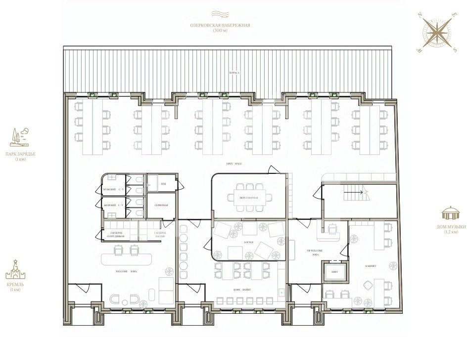 -расположен в 1 км от Кремля и парка Зарядье, в окружении музеев и храмов;
