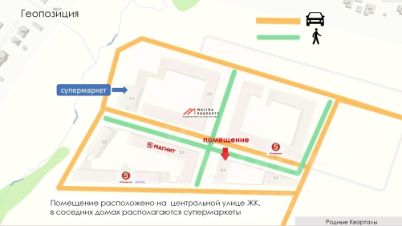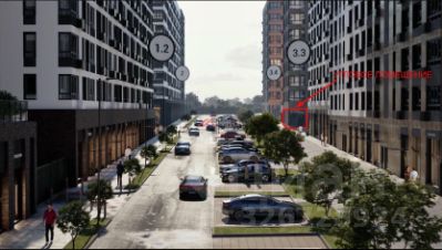 Помещение располагается в лучшем месте жилого комплекса, на пересечении дороги и двух широких пешеходных бульваров, в самом центре жилого комплекса. Интенсивный автомобильный и пешеходный трафик вдоль помещения. ЖК рассчитан 21 500 жителей. Ввод в эксплуатацию - 2 квартал 2026 года.