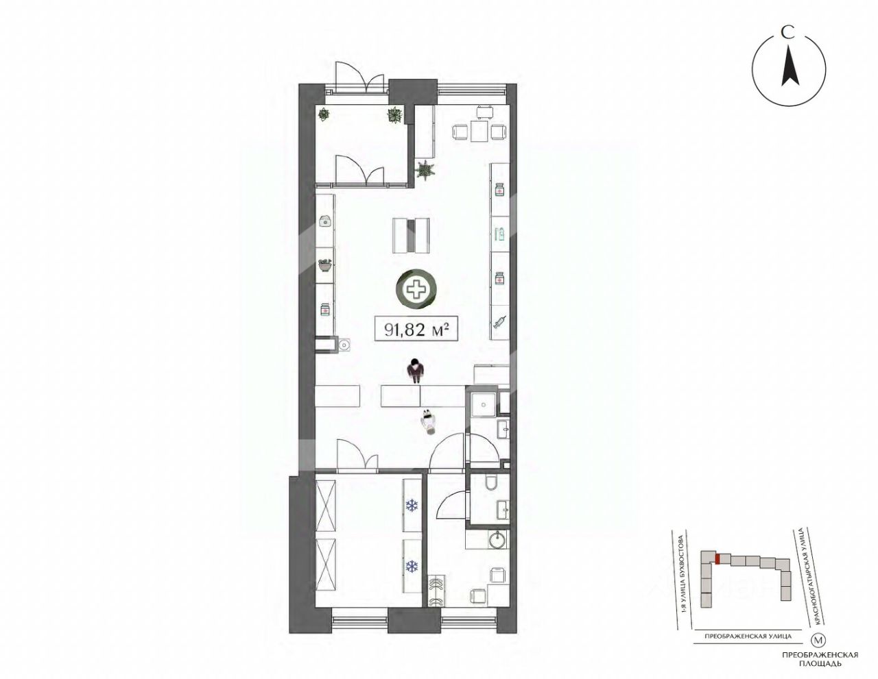 743339-f . Предлагаем помещение свободного назначения формата Street Retail, площадью 93 кв. м, расположенное на первом этаже жилого дома в ЖК "Преображенская площадь". Без комиссии для покупателя.
