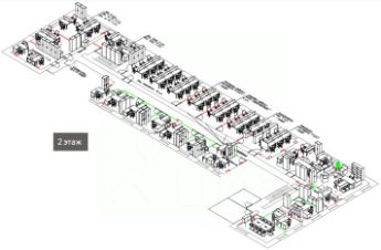 • Второй этаж (586,2 кв. м): оборудован переговорной комнатой, кабинетами и санузлами.