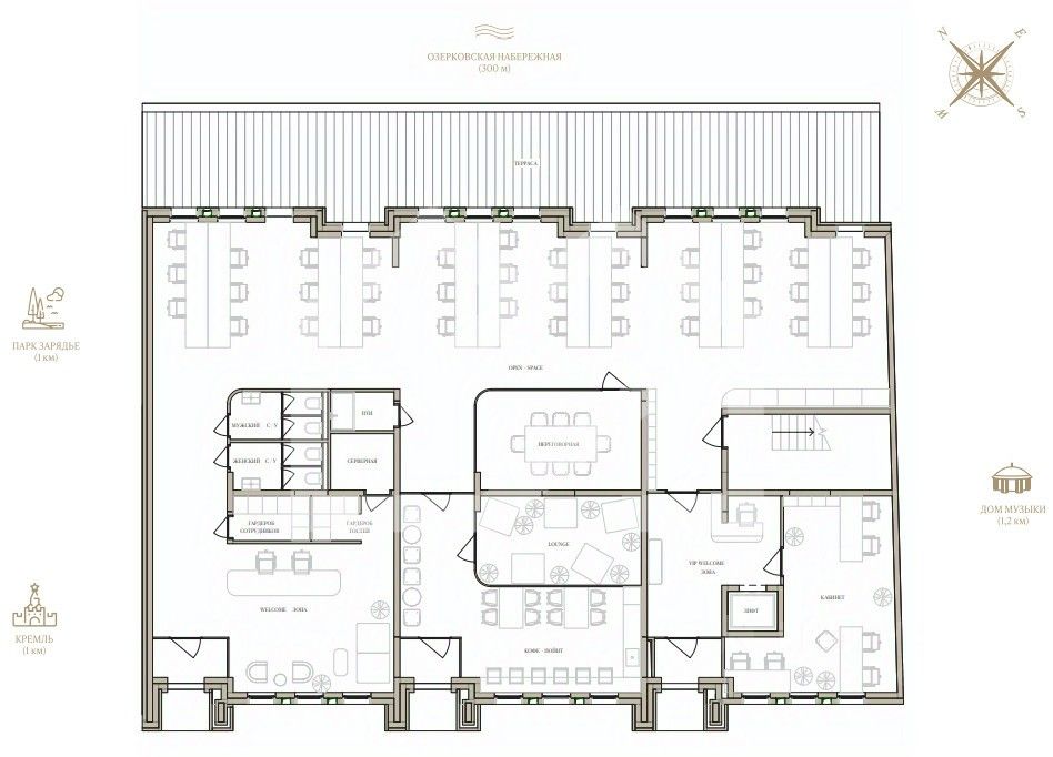 -расположен в 1 км от Кремля и парка Зарядье, в окружении музеев и храмов;