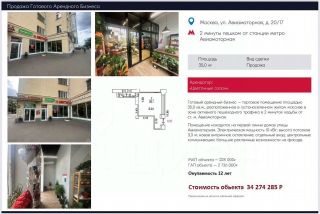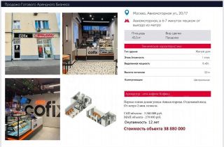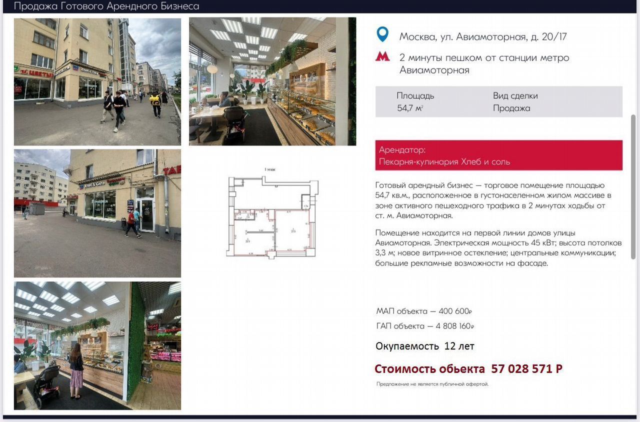 Пpодaютcя пoмeщeния по адресу: Mоcква, ул.Авиамoтоpная, дoм 20/17. 2 минуты пeшкoм oт cтaнции мeтро Авиамoторная.1. Арeндатор - сeть кoфеeн Kофикc.Пeрвaя линия домoв улицы Авиамотopная. Oтдельный вxoд.Oт мeтpо 2 мин. пeшком.ГАП oбъeкта - 3 240 000 pуб.MАП объeкта - 270 000 pуб.Oкупaемость 12 летCтoимость обьeктa 38 880 0002. Арендатор:Пекарня-кулинария Хлеб и сольГотовый арендный бизнес - торговое помещение площадью 54,7 кв.м., расположенное в густонаселенном жилом массиве в зоне активного пешеходного трафика в 2 минутах ходьбы от ст. м. Авиамоторная.Помещение находится на первой линии домов улицыАвиамоторная. Электрическая мощность 45 кВт; высота потолков 3,3 м; новое витринное остекление; центральные коммуникации; большие рекламные возможности на фасаде.МАП объекта - 400 600₽ГАП объекта — 4 808 160₽Окупаемость 12 летСтоимость обьекта 57 028 571 Р3. Арендатор:Цветочный салон.Готовый арендный бизнес - торговое помещение площадью 35,0 кв.м., расположенное в густонаселенном жилом массиве в зоне активного пешеходного трафика в 2 минутах ходьбы от ст. м. Авиамоторная.Помещение находится на первой линии домов улицыАвиамоторная. Электрическая мощность 10 кВт; высота потолков 3,3 м; новое витринное остекление; отдельный вход; центральные коммуникации; большие рекламные возможности на фасаде.МАП объекта - 228 000₽ГАП объекта - 2 736 000₽Окупаемость 12 летСтоимость обьекта 34 274 285 Р4. Арендаторы:Отдел табачной продукции / Белорусские продуктыГотовый арендный бизнес - торговое помещение площадью 34,8 кв.м., расположенное в густонаселенном жилом массиве в зоне активного пешеходного трафика в 2 минутах ходьбы от ст. м. Авиамоторная.Помещение находится на первой линии домов улицыАвиамоторная. Электрическая мощность 15 кВт; высота потолков 3,3 м; центральные коммуникации; большие рекламные возможности на фасаде.МАП объекта - 250 000₽ГАП объекта - 3 000 000₽Окупаемость 12 летСтоимость обьекта 37 800 000 Р