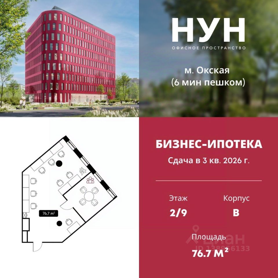 Продается офисное помещение площадью 76.7 м² в бизнес-центре НУН от застройщика Доминанта. ЮВАО, м. ОкскаяСрок реализации проекта - 3 квартал 2026 года. НУН - современный многофункциональный бизнес-центр с выразительным обликом, располагающийся в динамично развивающемся районе Москвы. Гостей и сотрудников бизнес-центра встречает яркое лобби с высокими потолками и витражными окнами. На первом этаже располагаются вендинговые автоматы, банкоматы и копировальный центр, где можно распечатать документы. Также здесь находится ритейл с магазинами и кафе. Для мероприятий, презентаций или совещаний в здании имеется конференц-зал. Особая деталь проекта — это эксплуатируемая кровля с озеленением и уютная лаундж-зона с видами на город. Характеристики объекта: - Класс "В" - Функциональные планировки от 63 м2 до 159 м2 - Высота потолков 3,6 м - Окна высотой 3 м с функцией проветривания - Отделка - 9 этажей - 4 пассажирских лифта - Центральное кондиционирование, отопление и водоснабжение - Приточно-вытяжная вентиляция - Круглосуточная охрана - IP -видеонаблюдение; - Подземный паркинг. Расположение: - 6 минут пешком до ст. м. "Окская"; - 7 минут на машине до СВХ; - 8 минут на машине до МКАД; - 10 минут на машине до ЮВХ; - 12 минут на машине до ТТК; - 16 минут пешком до ст. м. "Рязанский проспект"; - 20 минут пешком до D3 "Вешняки".Звоните прямо сейчас, чтобы узнать подробности!