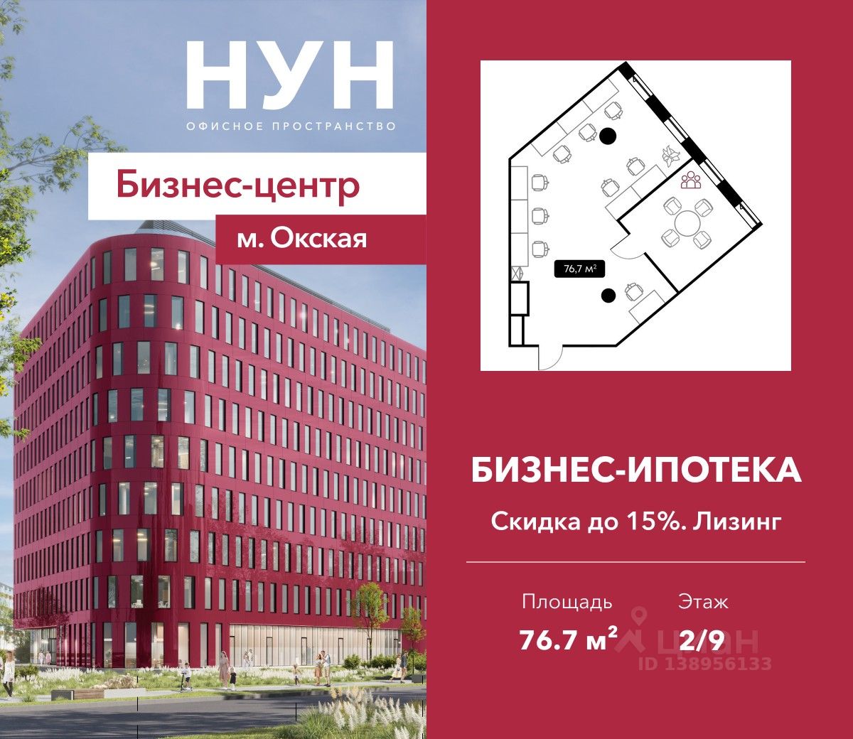 Продается офисное помещение площадью 76.7 м² в бизнес-центре НУН от застройщика Доминанта.