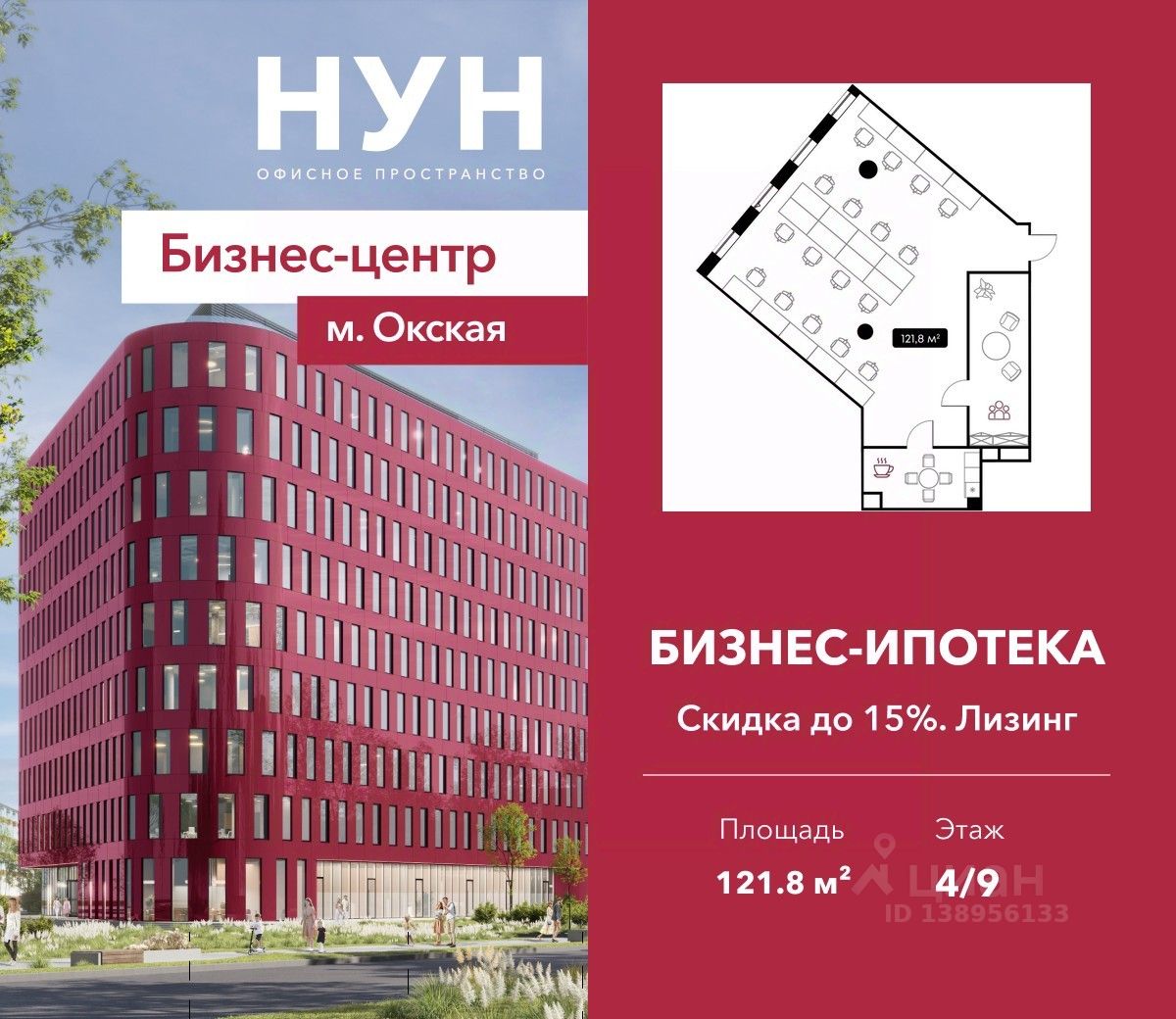 Продается офисное помещение площадью 121.8 м² в бизнес-центре НУН от застройщика Доминанта. ЮВАО, м. Окская Срок реализации проекта - 3 квартал 2026 года. НУН - современный многофункциональный бизнес-центр с выразительным обликом, располагающийся в динамично развивающемся районе Москвы. Гостей и сотрудников бизнес-центра встречает яркое лобби с высокими потолками и витражными окнами. На первом этаже располагаются вендинговые автоматы, банкоматы и копировальный центр, где можно распечатать документы. Также здесь находится ритейл с магазинами и кафе. Особая деталь проекта — это эксплуатируемая кровля с озеленением и уютная лаундж-зона с видами на город. Характеристики объекта: - Класс "В" - Функциональные планировки от 63 м2 до 159 м2 - Высота потолков 3,6 м - Окна высотой 3 м с функцией проветривания - Отделка - 9 этажей - 4 пассажирских лифта - Центральное кондиционирование, отопление и водоснабжение - Приточно-вытяжная вентиляция - Круглосуточная охрана - IP -видеонаблюдение; - Подземный паркинг. Расположение: - 6 минут пешком до ст. м. "Окская"; - 7 минут на машине до СВХ; - 8 минут на машине до МКАД; - 10 минут на машине до ЮВХ; - 12 минут на машине до ТТК; - 16 минут пешком до ст. м. "Рязанский проспект"; - 20 минут пешком до D3 "Вешняки". Звоните прямо сейчас, чтобы узнать подробности!