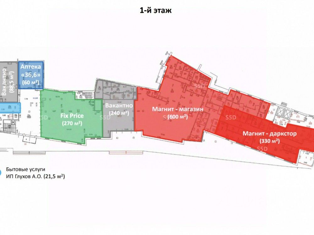 1) супермаркет "Магнит" и даркстор "Магнит" 930 кв.м.; фикс прайс - 270 кв.м, свободные с отдельным вход - 240 кв.м; Аптека 36/6;