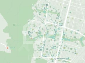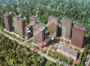 -корпуса расположены на едином стилобате, в котором предусмотрены сквозные пешеходные арки, соединяющие дворовое пространство и территорию Битцевского леса;
