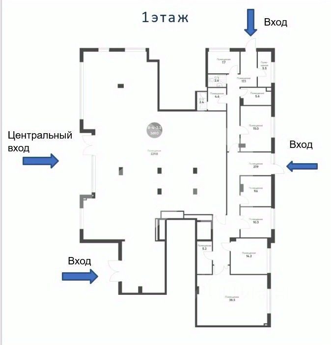 -Помещение общей площадью 396 кв. м., включает: торговое помещение (229.8 кв. м), коридоры (27.9 кв. м и 17.1 кв. м), кладовые (5.2 кв. м, 38.5 кв. м, 9.6 кв. м), кабинеты и служебные помещения (14.2 кв. м, 10.3 кв. м, 7.7 кв. м, 15 кв. м), а также гардеробную (4.6 кв. м), душевую (2.4 кв. м), санузел (2.6 кв. м), помещение охраны (5.5 кв. м) и помещение для уборочного инвентаря (5.6 кв. м). Также на -1 этаже зона разгрузки 31,30 м²: помещение (5,60 м²) и загрузочная (25,70 м²).