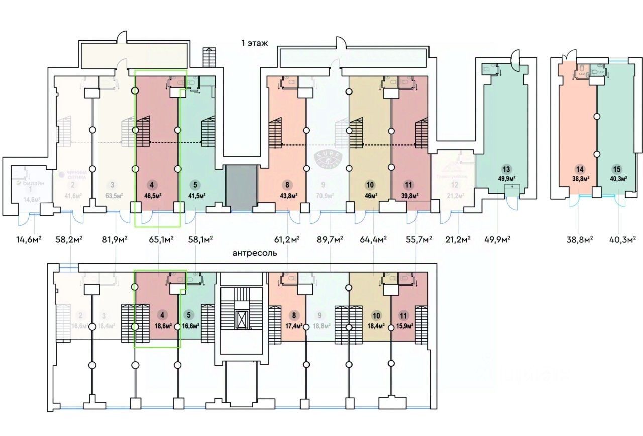 Описание помещения: Блок 4 на плане, площадью 65,5 м2, занимает 1 этаж и антресоль.