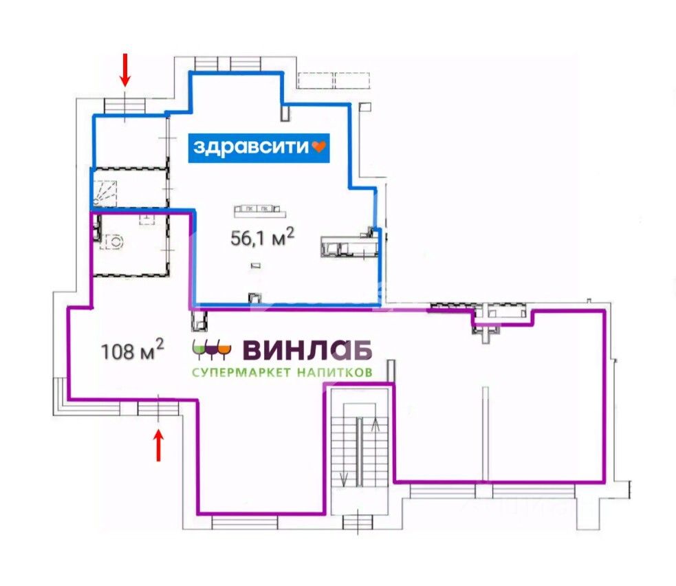 818775. Предлагаем помещение свободного назначения с арендаторами ЗдравСити и ВинЛаб, площадью 164,1 кв. м., расположенное на первом этаже жилого дома. Угловой блок. Без комиссии для покупателя.