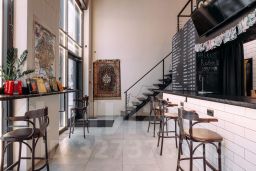 Просторное светлое помещение с панорамным остеклением. Высота потолков 6,53 метра позволяет организовать торговое пространство.