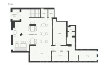 1 уровень площадью 145,5 кв.м: зал 65 кв.м, бар 16,5 кв.м, открытая кухня 17 кв.м, 2 гостевых санузла и один для персонала, кладовая и все необходимые для общепита технические помещения.