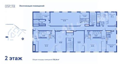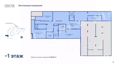 Первый этаж — 1 324 м², второй этаж — 732 м², третий этаж — 734 м², подземный этаж (-1) — 766 м².