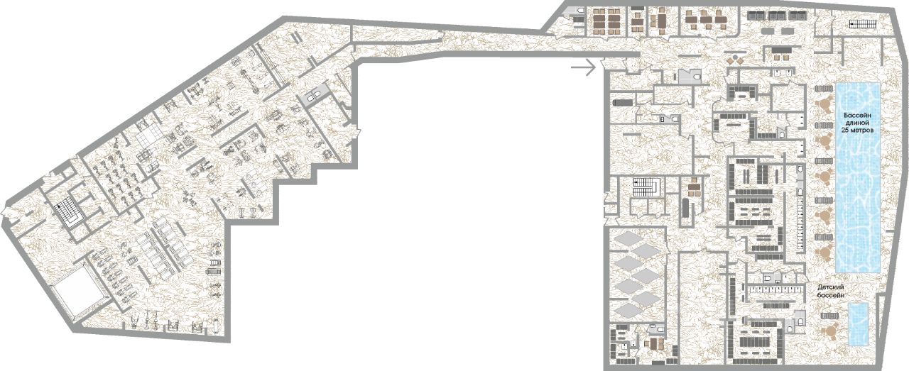 Просторные мокрые зоны, включая хаммам, джакузи и помещения для SPA-процедур;