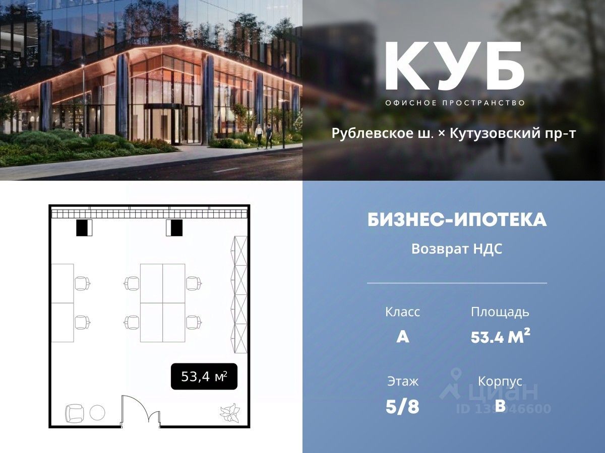 Продается офисное помещение площадью 53.4 м² в бизнес-центре КУБ класса "А" от застройщика Доминанта.