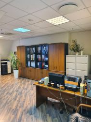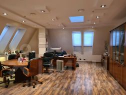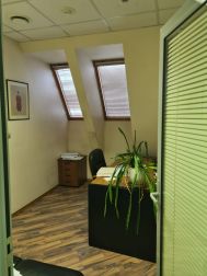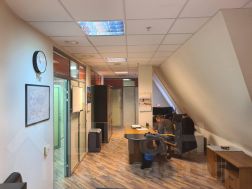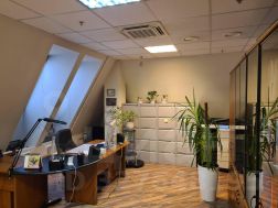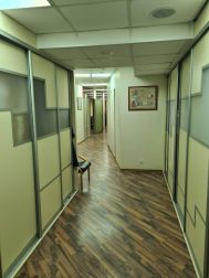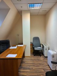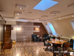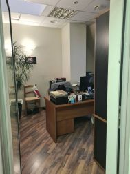 5 этаж (мансардный) общая площадь: 353.9 м2. Часть этажа. Помещение состоит из двух блоков с отдельными входами. ( 253. 2 м2 и 90.7 м2) В помещение несущих стен нет. Планировка смешанная: кабинет руководителя, переговорная, юр.отдел, бухгалтерия, кабинеты, кухня-столовая, с/узлы "М" и "Ж" на этаже. Высота потолка от 3 м. Мощность 17.36 кВА при напряжении 220/380 вольт. Стены выполнены из монолитного железобетона и кирпича, отделаны гипсокартоном, оклеены обоями с покраской. Внутренние перегородки между кабинетами - каркасные, выходящие в коридор из алюминиевого профиля со стеклом с жалюзи внутри. Окна в мансардной части "Велюкс" полы-ламинат, потолки подвесные "Армстронг"