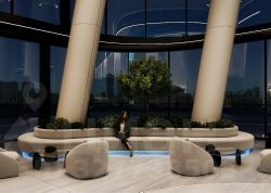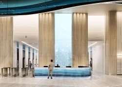 Пространства лобби обладают двусветной структурой, площадью до 500 кв. м, высотой потолков 8 м и витражным остеклением, что обеспечивает высокую степень естественного освещения.