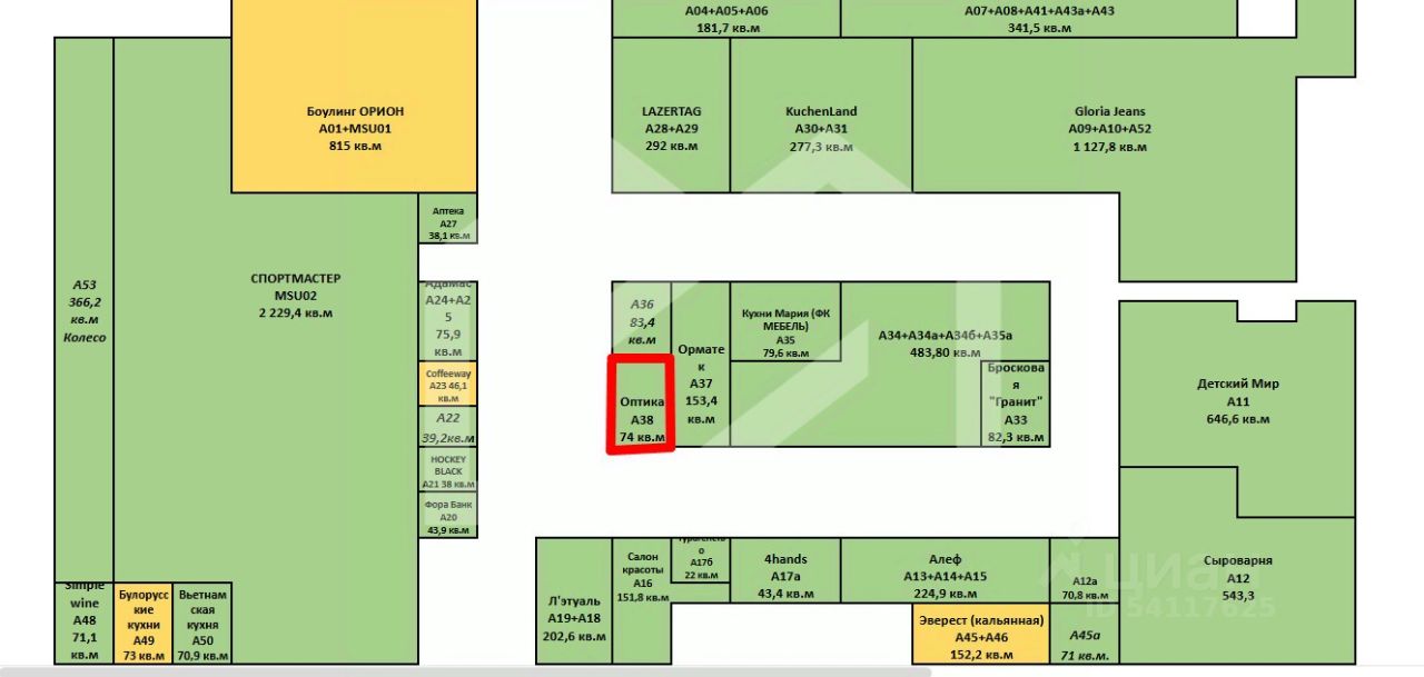 1119697. Предлагаем помещение свободного назначения с арендатором "Оптика" в МФК "Митино Парк", площадью 74 кв. м, расположенное на первом этаже 3-этажного здания. Без комиссии для покупателя.