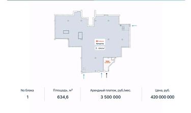 Площади: от 24,0 до 634,6 кв.м (открытая планировка, свободное назначение)