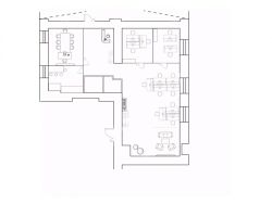 Помещение с двумя входами: один с улицы, другой из подъезда жилого здания. Первый этаж. Много естественного света благодаря окнам, которые расположены с двух сторон