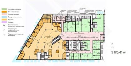 На первых трех этажах расположена торговая галерея, начиная с 14-го этажа - апартаменты.