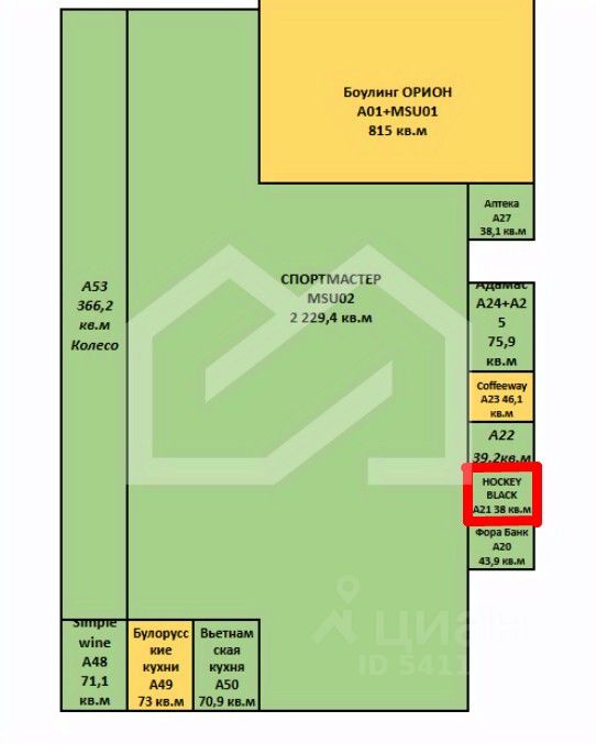 1119709. Предлагаем помещение свободного назначения с арендатором "HOCKEY BLACK" в МФК "Митино Парк", площадью 38 кв. м, расположенное на первом этаже 3-этажного здания. Без комиссии для покупателя.