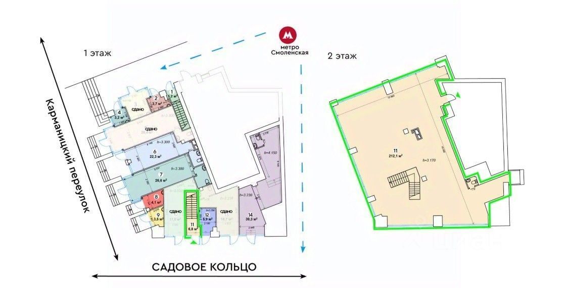 Описание помещения: Отдельный вход с 1-го этажа, лестничный пролет. Большие витринные окна. Отдельный вход с фасада.