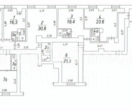 По документу площадь помещения (номер 6 на схеме) 21,3 кв.м Полезная площадь около 15 кв.м - в углу комнаты трубы (при желании можно отгородить стеной, конечно, оставив к ним доступ).