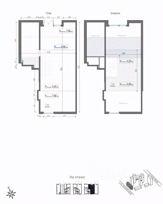 1 уровень - 187,8 кв. м с высотой потолка 3,45 м., 2 уровень - 56,6 кв. м. с высотой потолка 3,95 м.