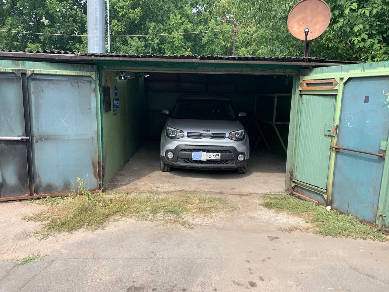 В гараже - бетонный пол, свет, электричество, полки для хранения.