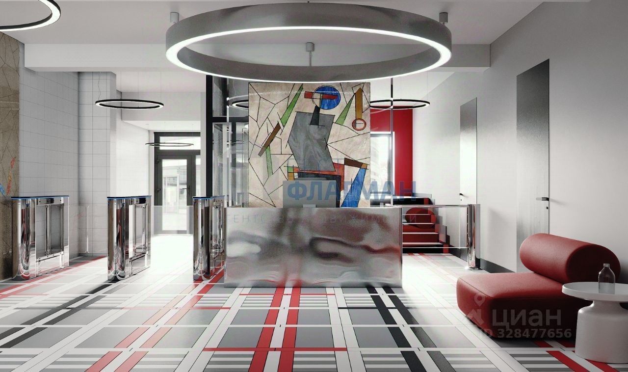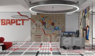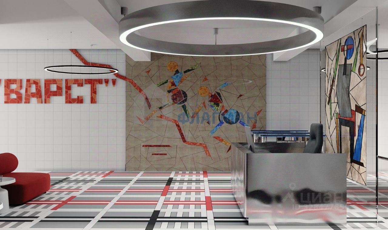 Отделка выполнена в эстетике советского авангарда — геометричные формы, выразительные