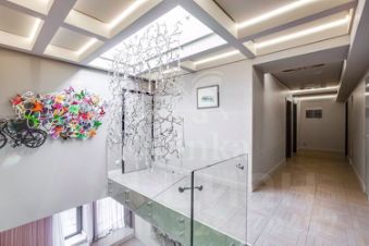 На втором уровне расположены две детские спальни, кабинет, главная спальня с двумя гардеробными (мужская и женская) и санузлами. Инженерное оборудование высокого уровня - система "умный дом". Отдельная хозяйственная комната и собственный пункт охраны.
