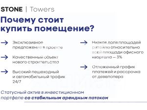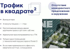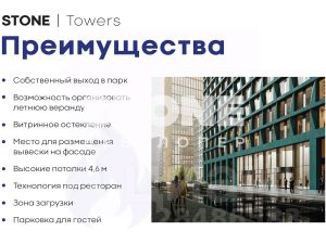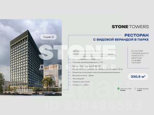 В реализации - помещение под ресторан с возможностью организации летней веранды в составе бизнес-центра класса А STONE Towers (башня D) напрямую от девелопера STONE, лидера офисного рынка.