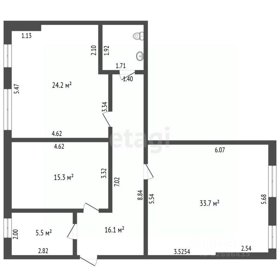 Метраж комнат: 33,7 кв.м., 24,2 кв.м., 15,3 кв.м., 5,5 кв.м. В трёх комнатах есть мокрые точки. 15 кВт.