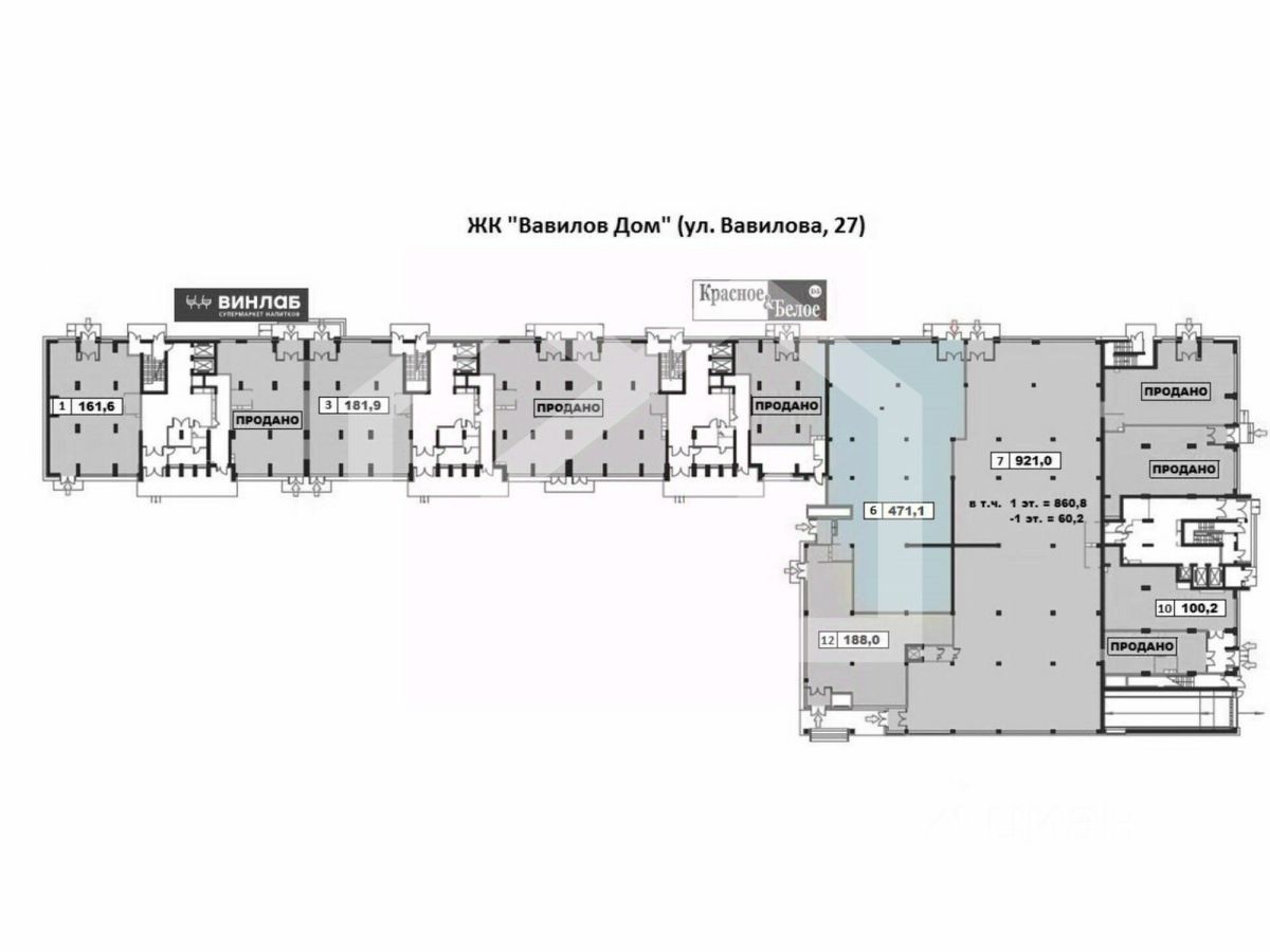 657573. Предлагаем к приобретению помещение свободного назначения с арендатором "Магнит", площадью 471.1 кв. м., расположенное на первом этаже 19-этажного жилого дома в ЖК "Вавилов Дом". Без комиссии для покупателя.