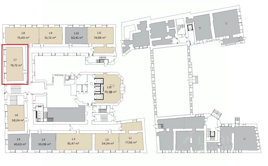 На цокольном и первом этажах расположена торговая галерея, в которой представлены 22 помещения от 25 кв. м в формате ритейла и помещений свободного назначения.