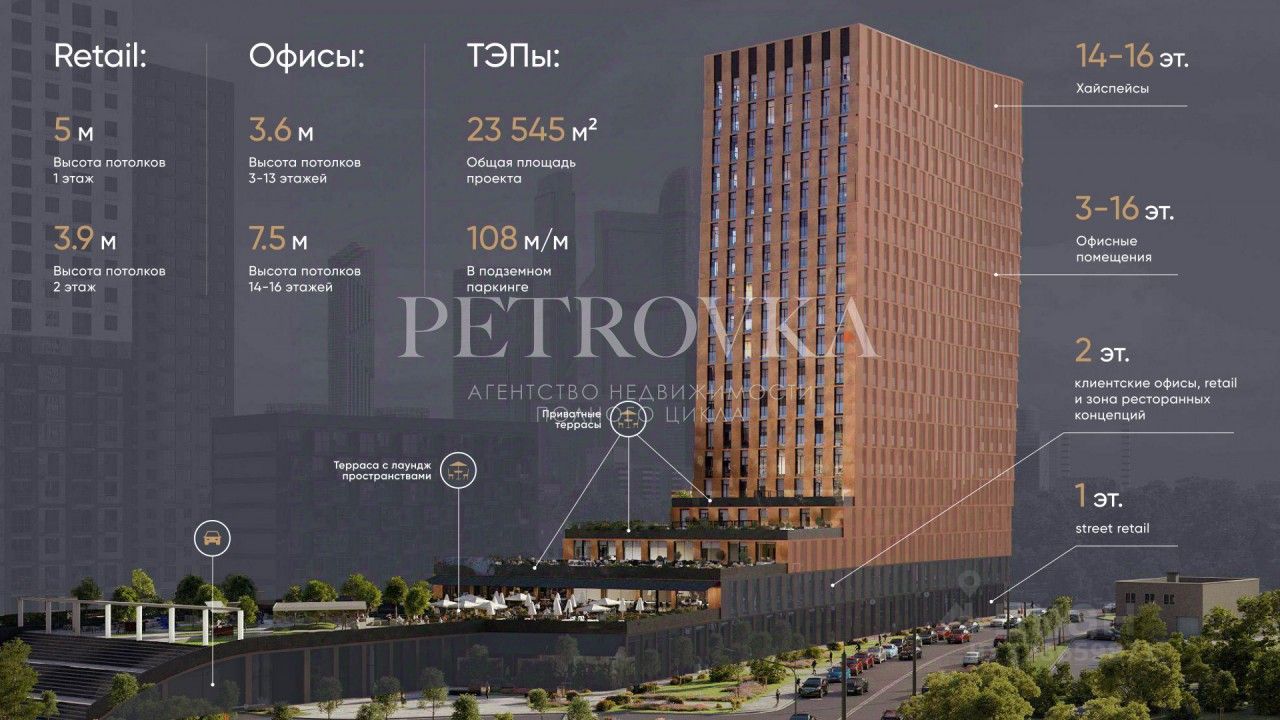 Общая площадь здания: 23 545 м², 16 этажей + подземный паркинг на 108 мест.