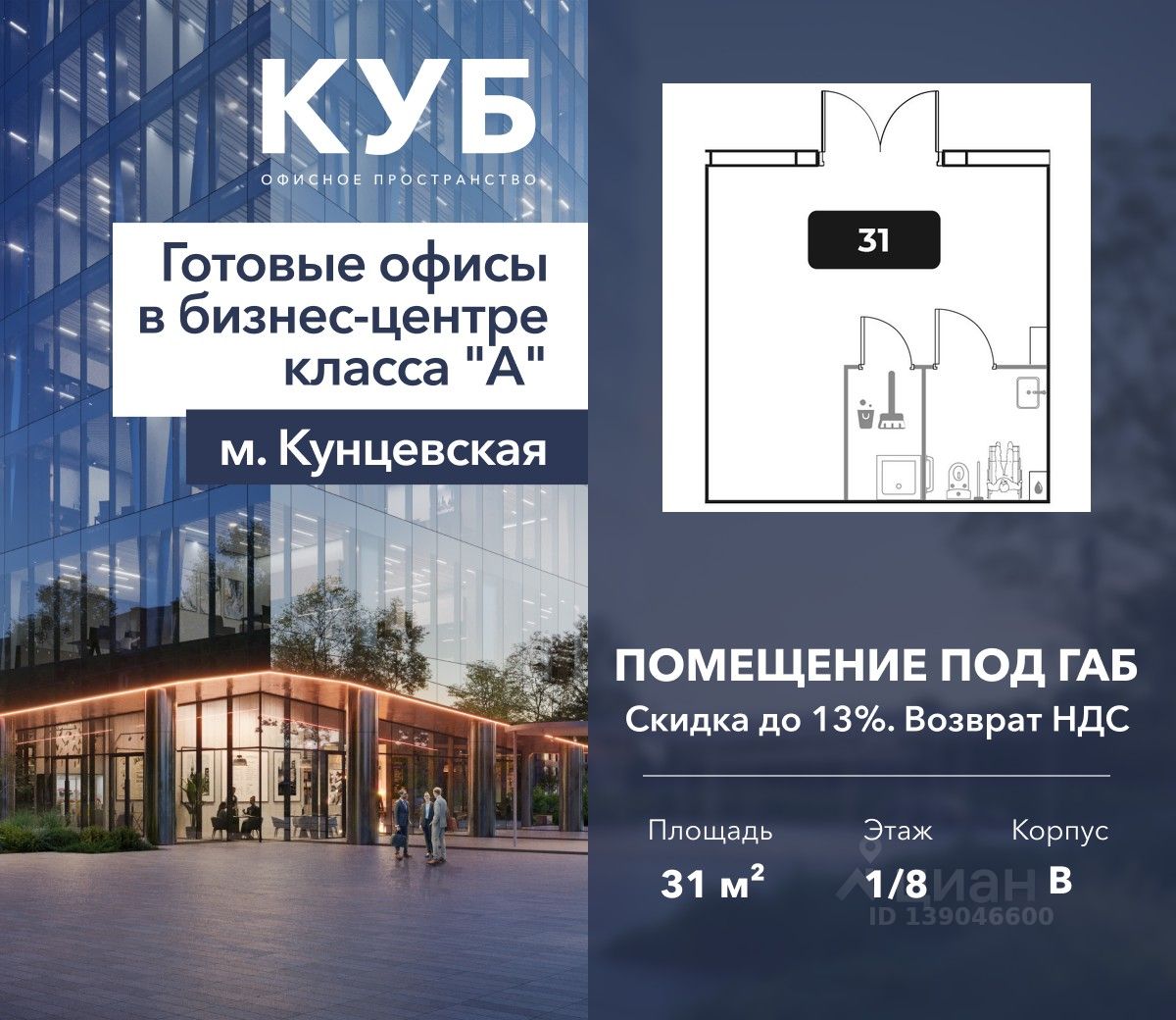 Продается помещение под готовый арендный бизнес площадью 31 м² в бизнес-центре КУБ класса "А" от застройщика Dominanta.