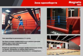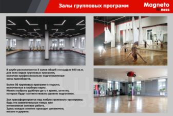 К услугам тренировочный зал с зоной для силовых, кардио и атлетических тренировок, ринг. Есть оборудованные помещения для аэробных и и танцевальных программ. А также сауна и хамам, массажный кабинет и солярий.