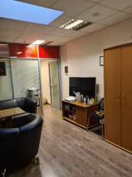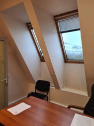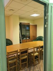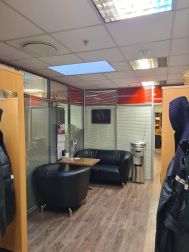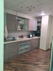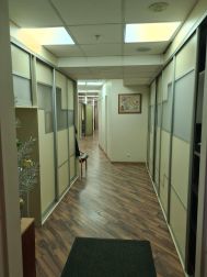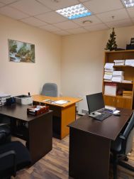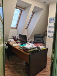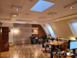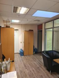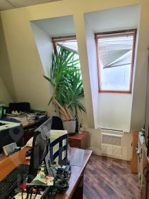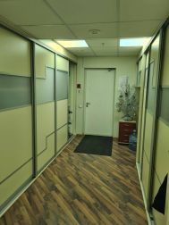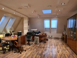 5 этаж (мансардный) общая площадь: 353.9 м2. Часть этажа. Помещение состоит из двух блоков с отдельными входами. ( 253. 2 м2 и 90.7 м2) В помещение несущих стен нет. Планировка смешанная: кабинет руководителя, переговорная, юр.отдел, бухгалтерия, кабинеты, кухня-столовая, с/узлы "М" и "Ж" на этаже. Высота потолка от 3 м. Мощность 17.36 кВА при напряжении 220/380 вольт. Стены выполнены из монолитного железобетона и кирпича, отделаны гипсокартоном, оклеены обоями с покраской. Внутренние перегородки между кабинетами - каркасные, выходящие в коридор из алюминиевого профиля со стеклом с жалюзи внутри. Окна в мансардной части "Велюкс" полы-ламинат, потолки подвесные "Армстронг"