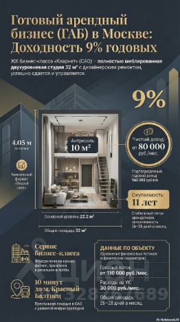 Продается готовый арендный бизнес (ГАБ) — стильная двухуровневая студия 32 м² в Москве (САО, район Коптево). Апартаменты с дизайнерским ремонтом расположены в ЖК Кларнет на улице Клары Цеткин, всего в 10 минутах пешком от метро Красный Балтиец и в шаговой доступности от м. Войковская