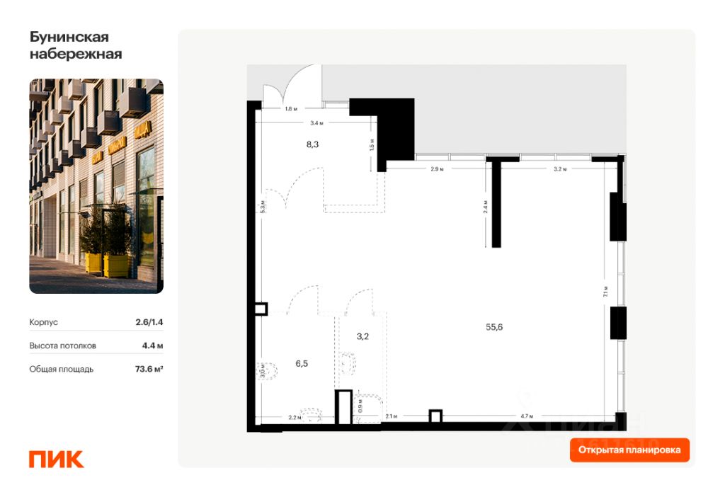 Коммерческое помещение расположено с внешней стороны здания. Его витрины будут иметь высокую визуальную доступность и привлекать внимание не только жителей квартала "Бунинская набережная", но и соседних домов.