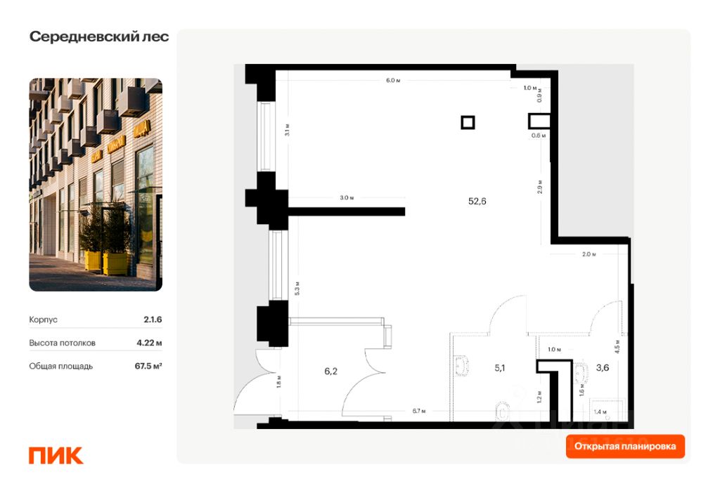 - Открытая планировка, возможно объединить несколько помещений