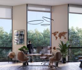 - На первых этажах офисных зданий просторные лобби с комфортной зоной ожидания, супермаркет, торговые помещения, отделения банков и сервисных служб, фитнес-студия