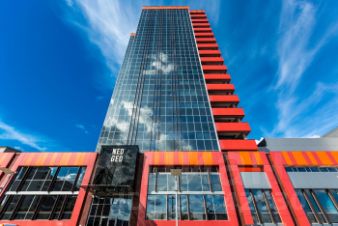 Нео Гео — дизайнерский бизнес-центр класса В+ площадью 125 000 м², есть офисы с ремонтом, без ремонта, с мебелью и без, двухуровневые, представительские от 600 м², офисы с отдельным входом, ритейл с витринным остеклением. Торговая галерея протянулась на 120 метров. В окружении жилой район, ежедневный поток бизнес-центра до 12 000 человек. В дизайнерских лобби отделка с деревянными элементами, установлены сенсорные панели из белого кориана. В атриумах поставили качели, искусственную траву и напечатанные на 3D принтере арт-объекты красного цвета.