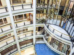 -в здании есть представительское лобби, просторный атриум, фитнес-зал и сауна, установлены панорамные лифты;