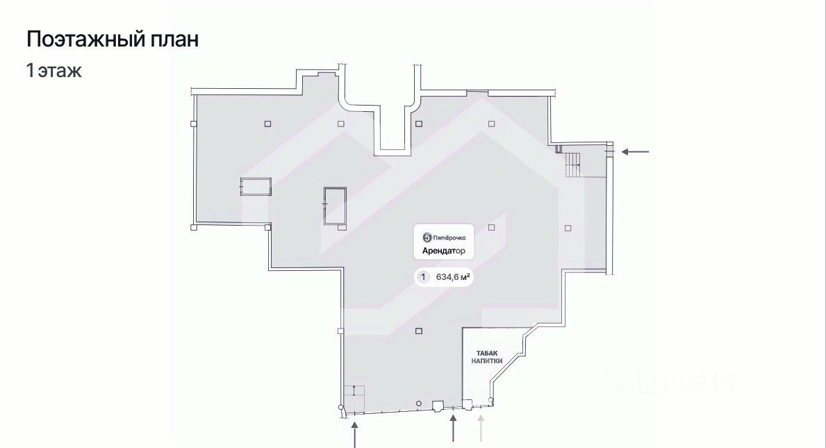 1095328. Предлагаем к приобретению торговое помещение с якорным арендатором - сеть супермаркетов "Пятерочка", площадью 634,6 кв. м., расположенное на первом этаже жилого дома. Без комиссии для покупателя.